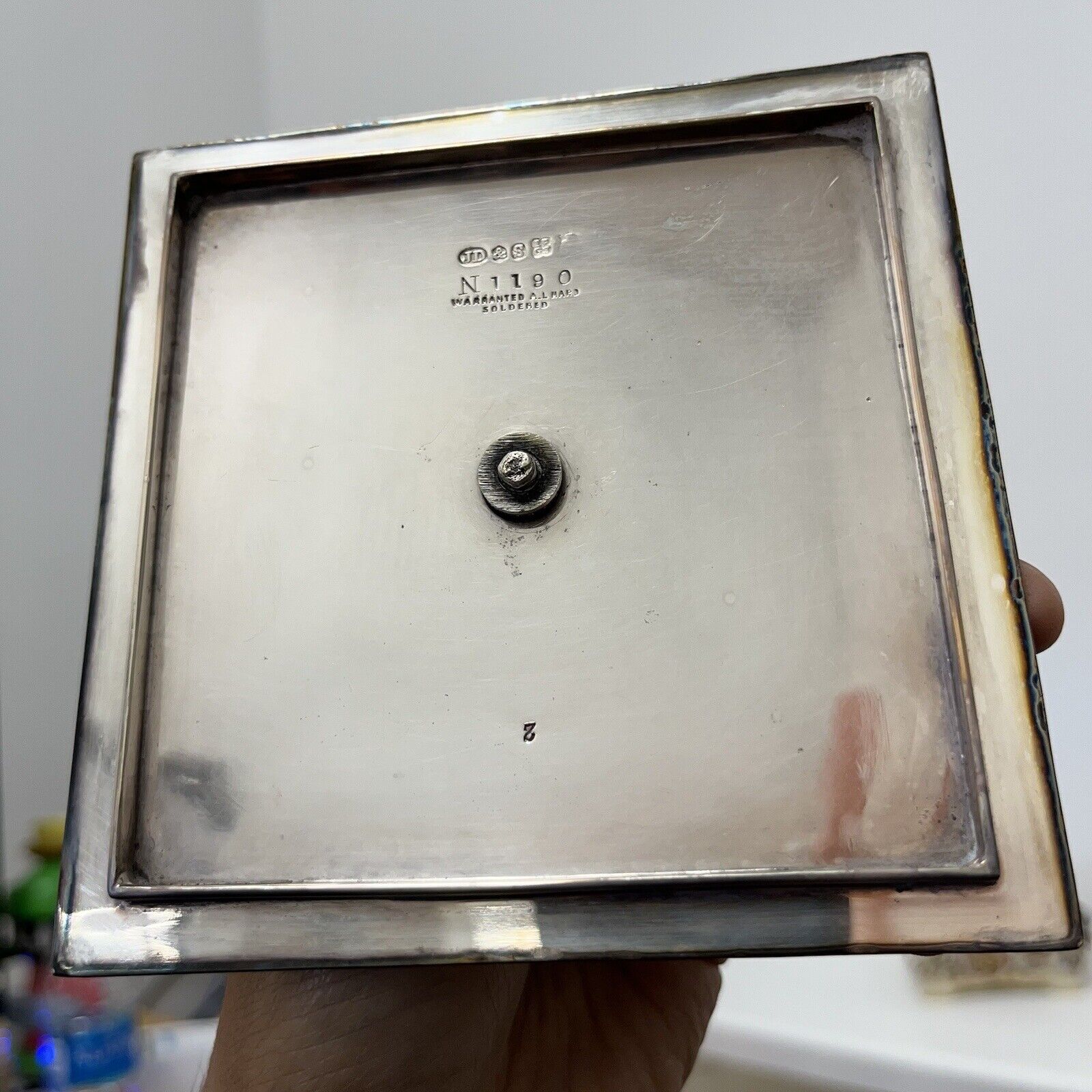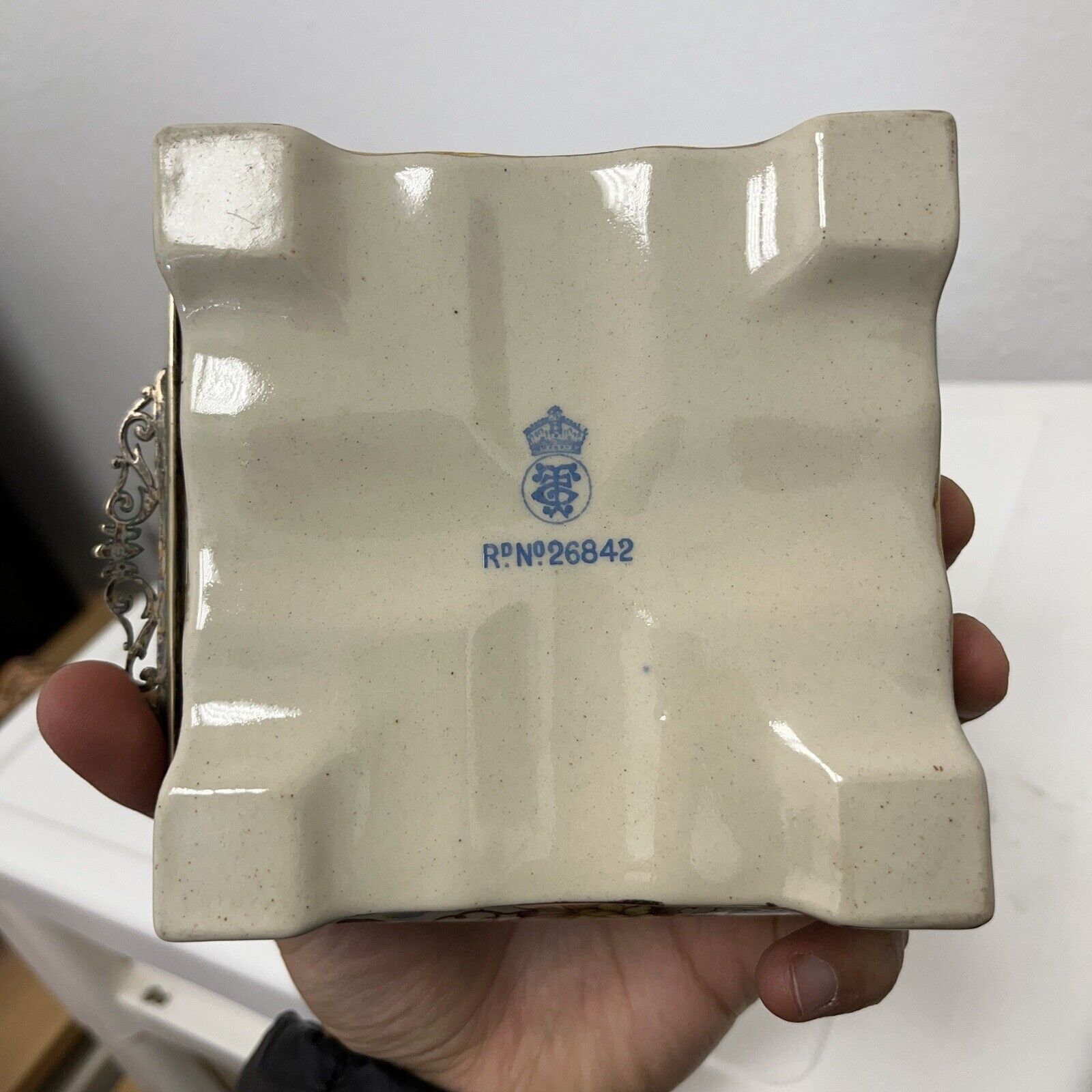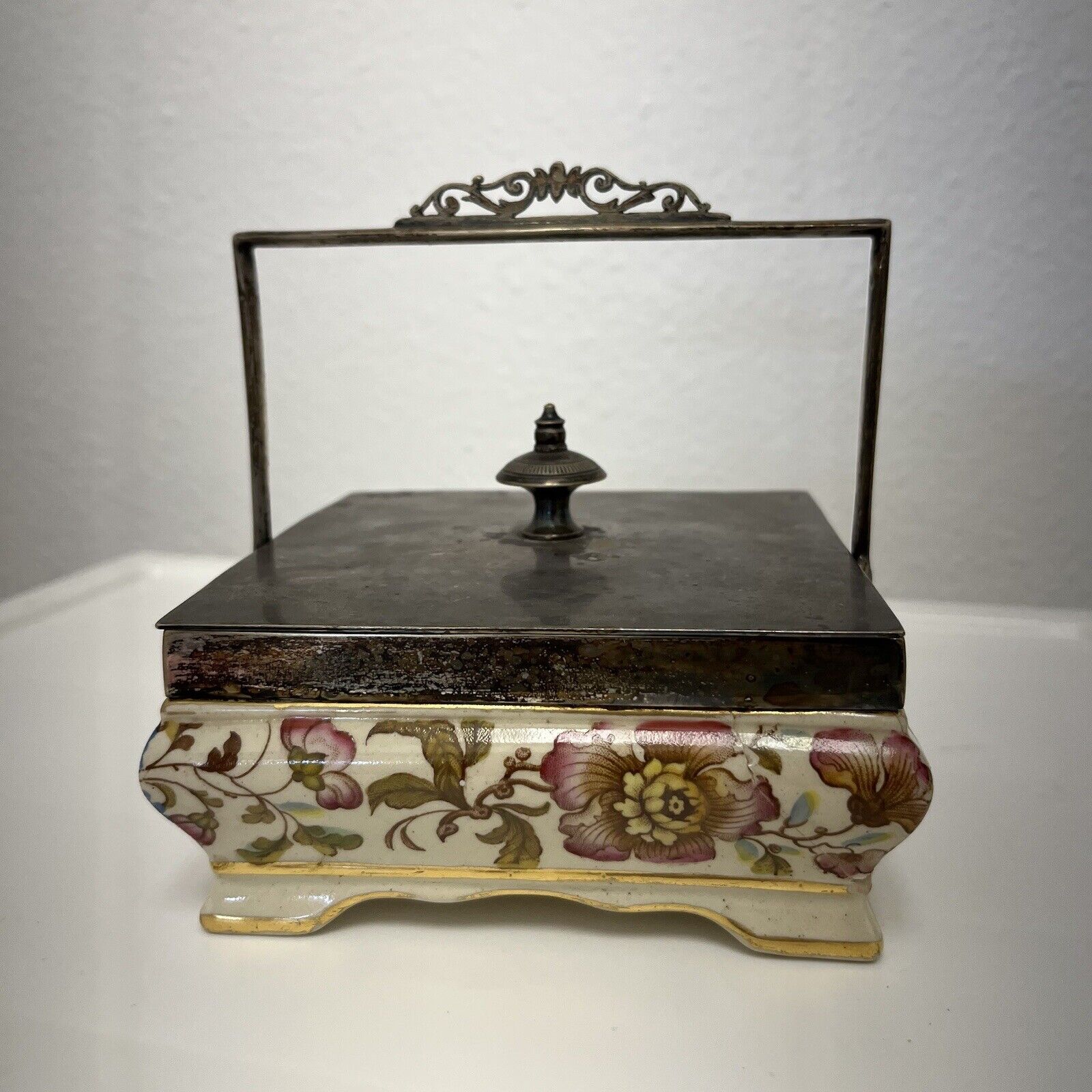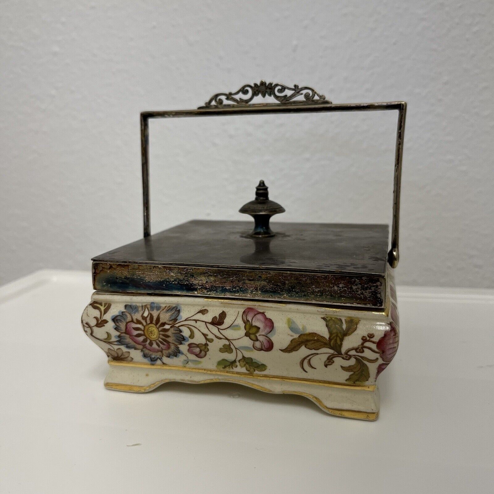Antique JD & S Trinket Stash Box Floral Ceramic EPGS German Silver Lid w/ Handle