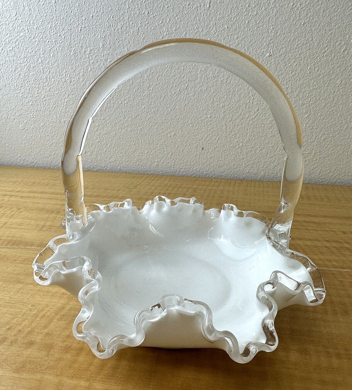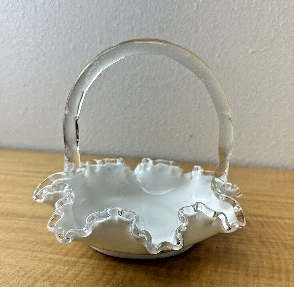 Fenton Milk Glass Bridal Wedding Ruffled Basket, 6 3/4" High, 7 1/2" Diameter