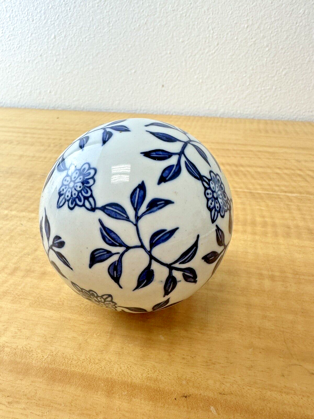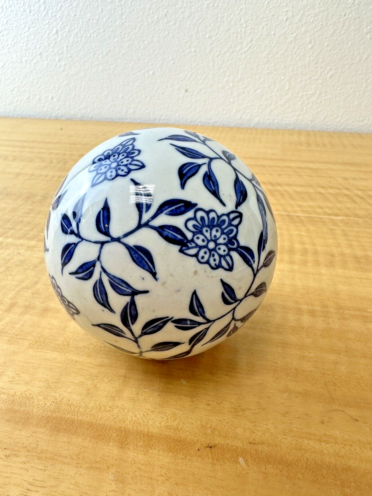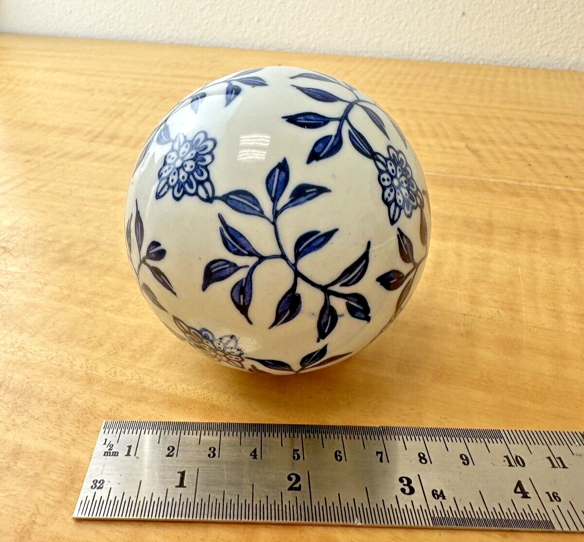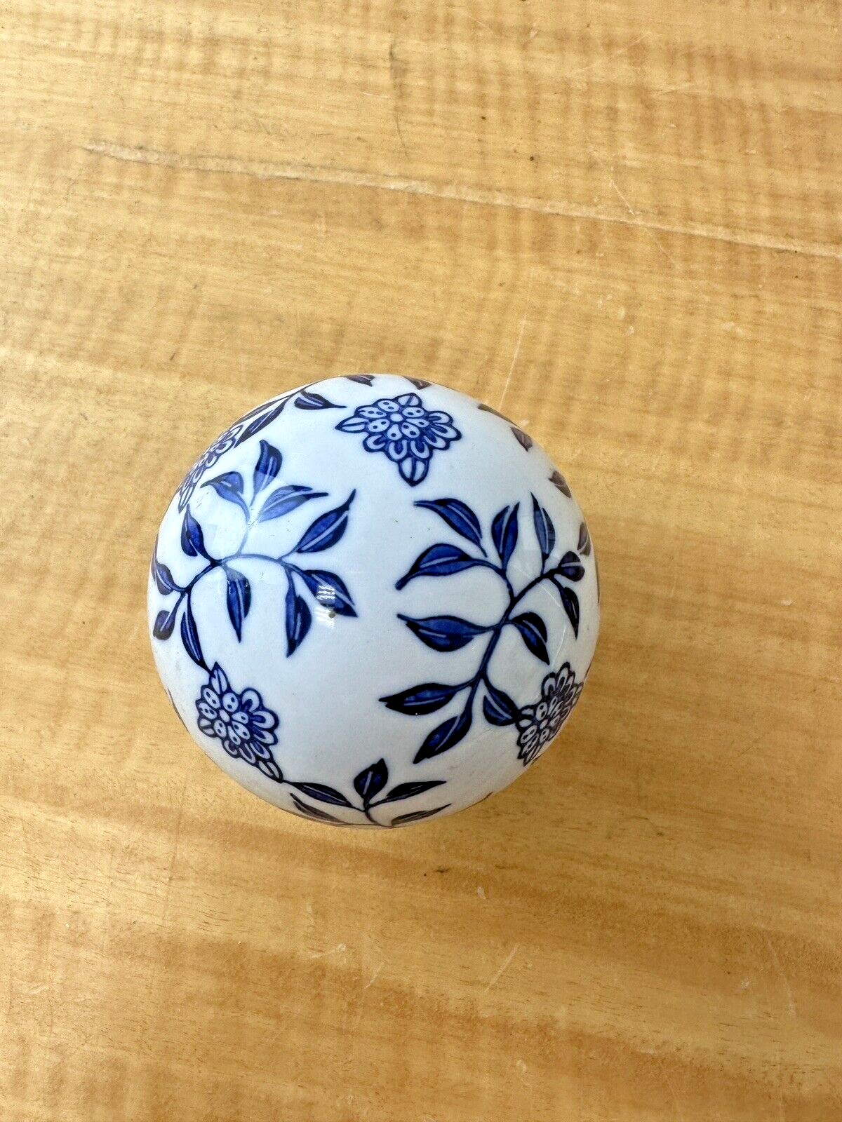 Glazed Blue White Spherical Porcelain Carpet Ball Daisy Vine Floral 3" VTG