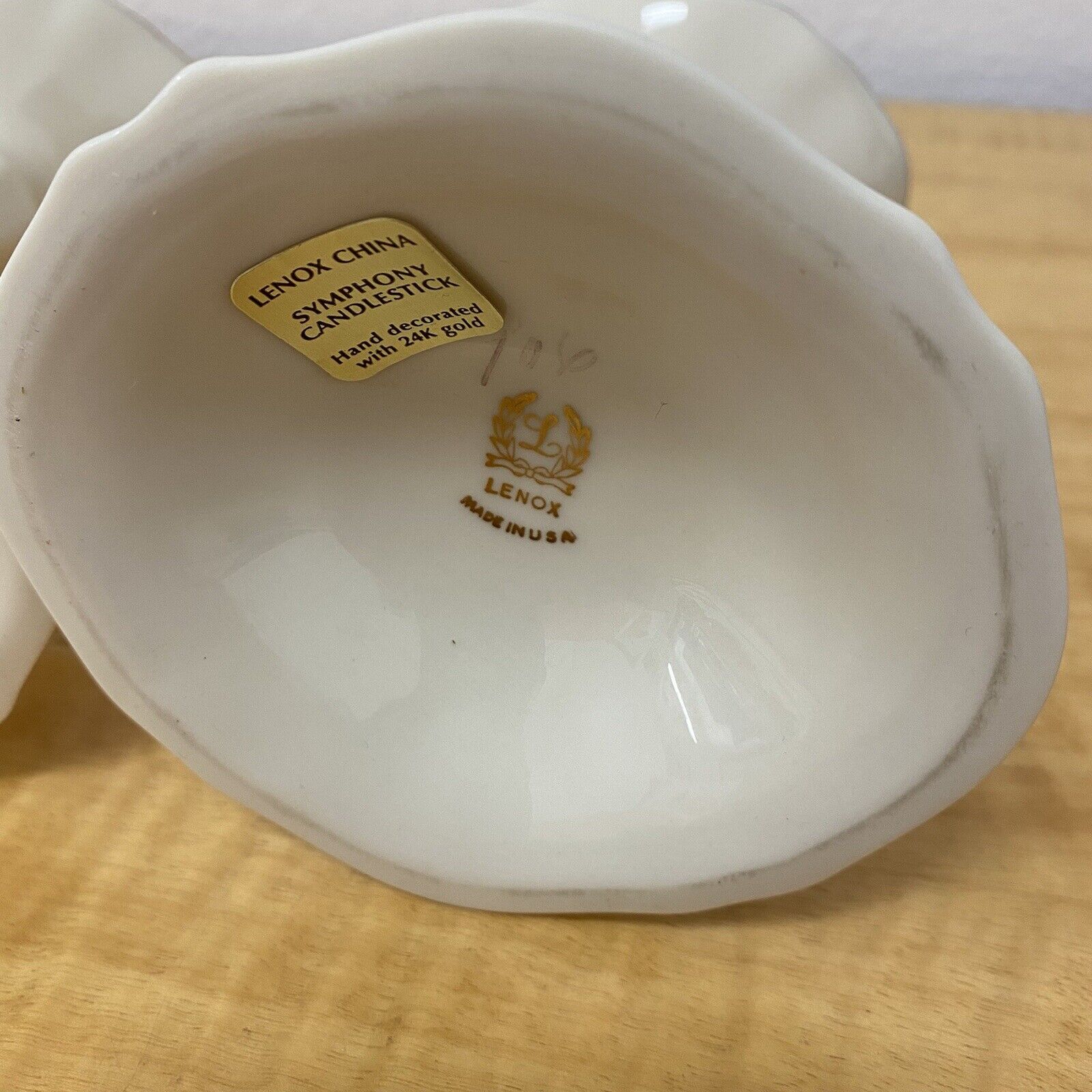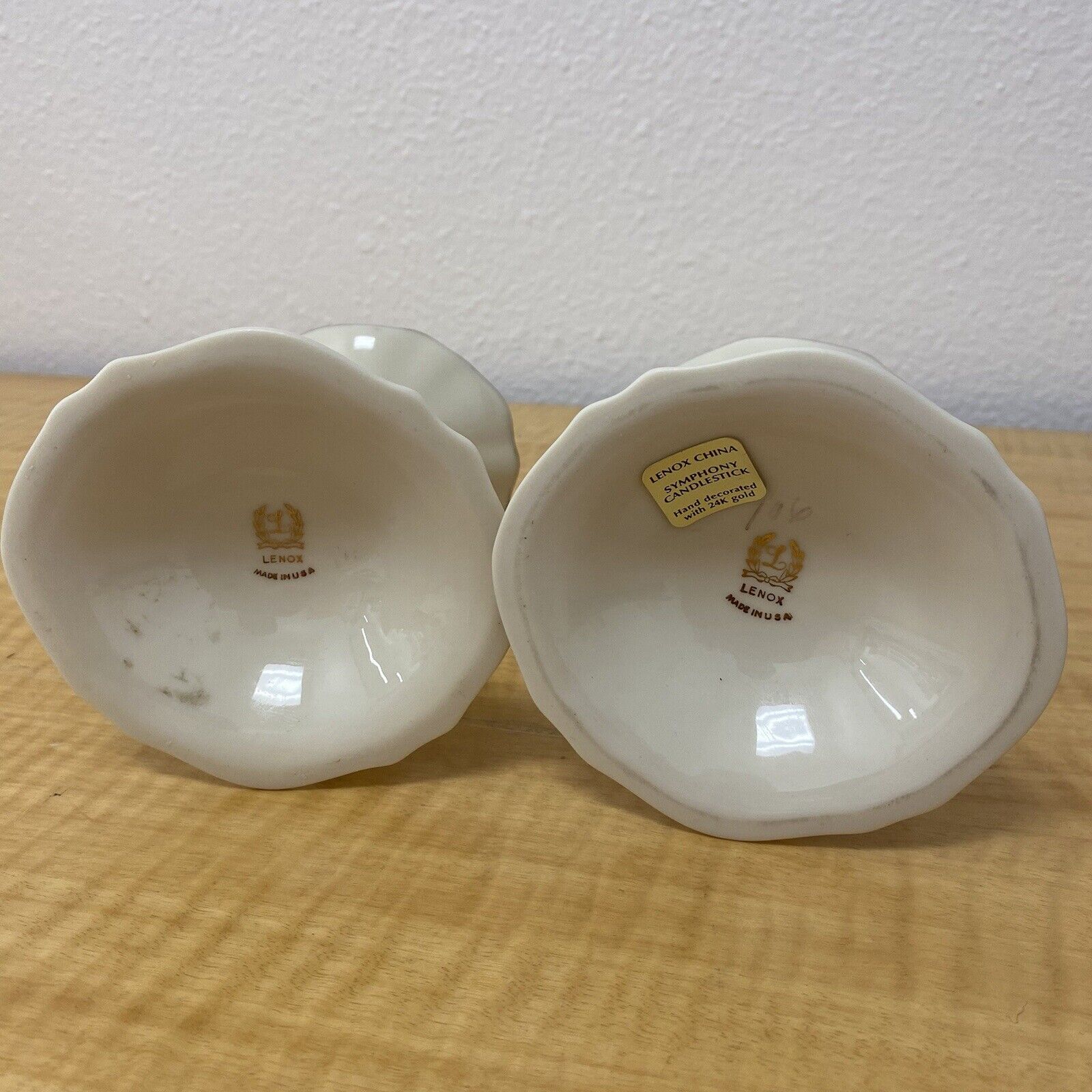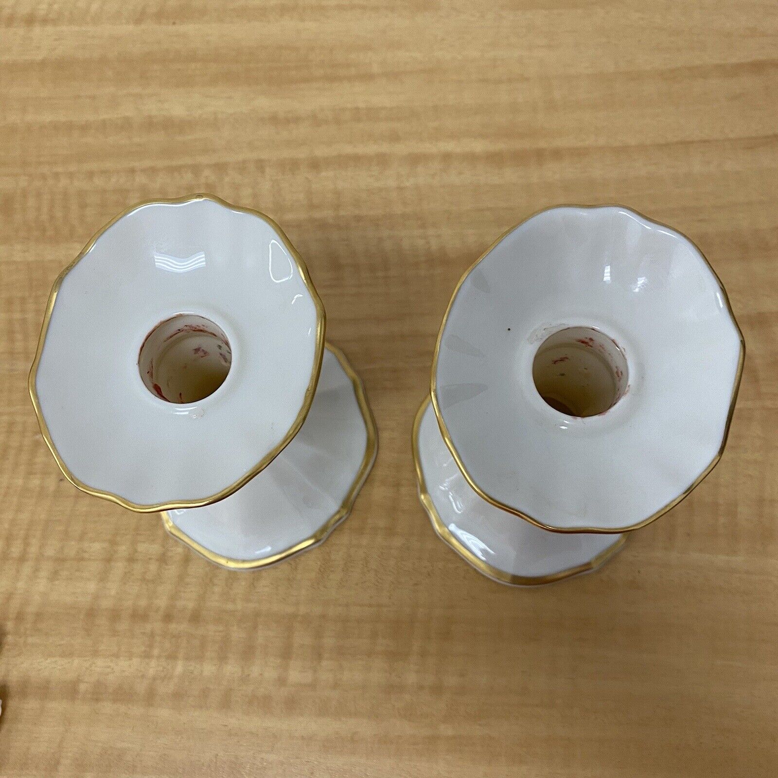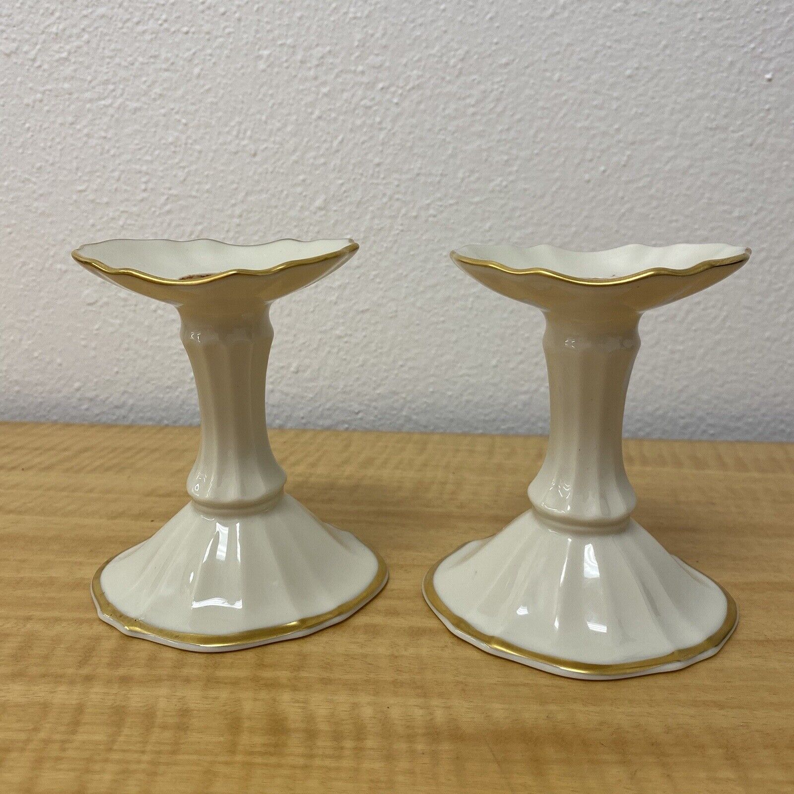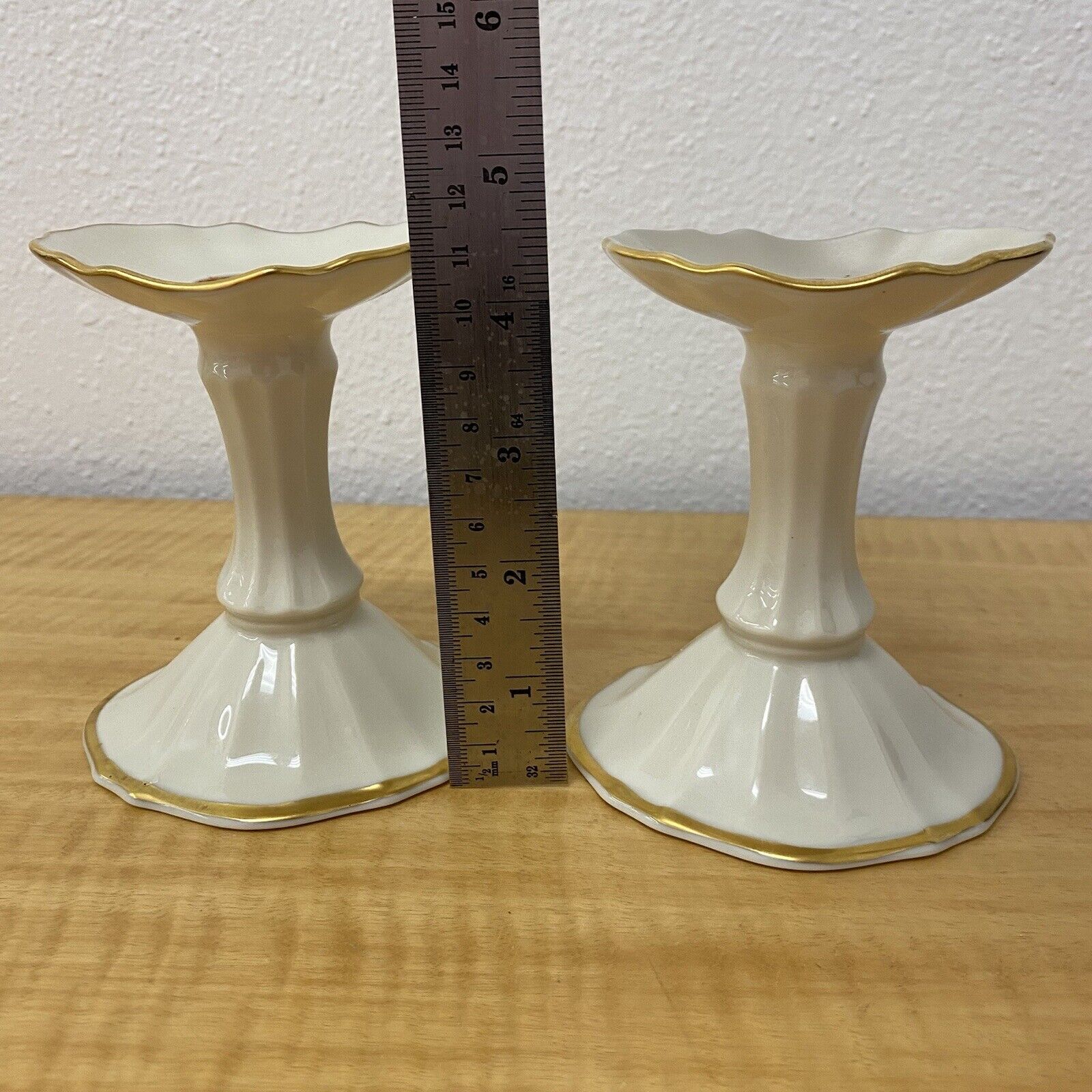 Pair Of Lenox China Symphony Candlestick Holders Ivory with 24k Gold Trim 4.5"