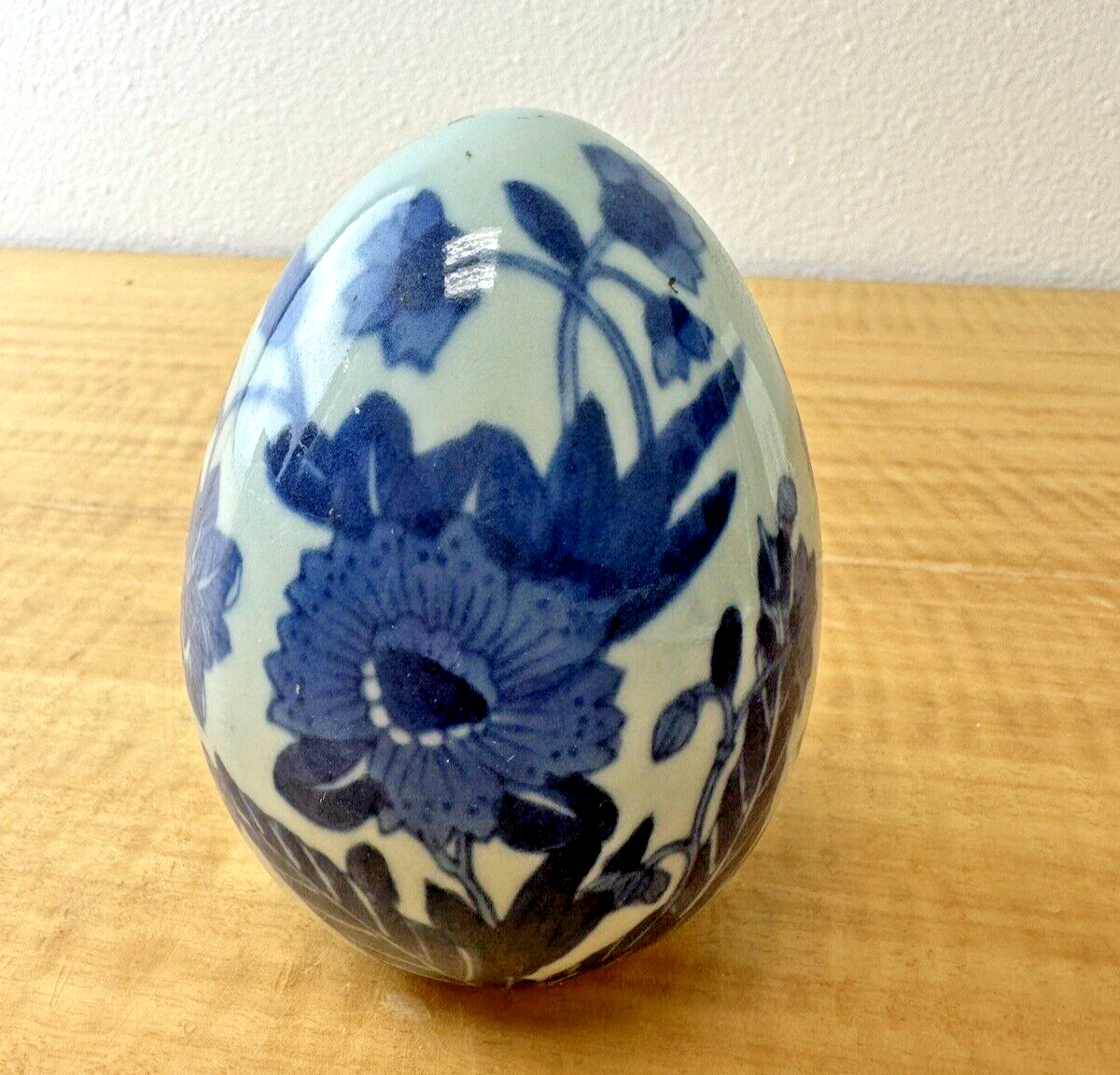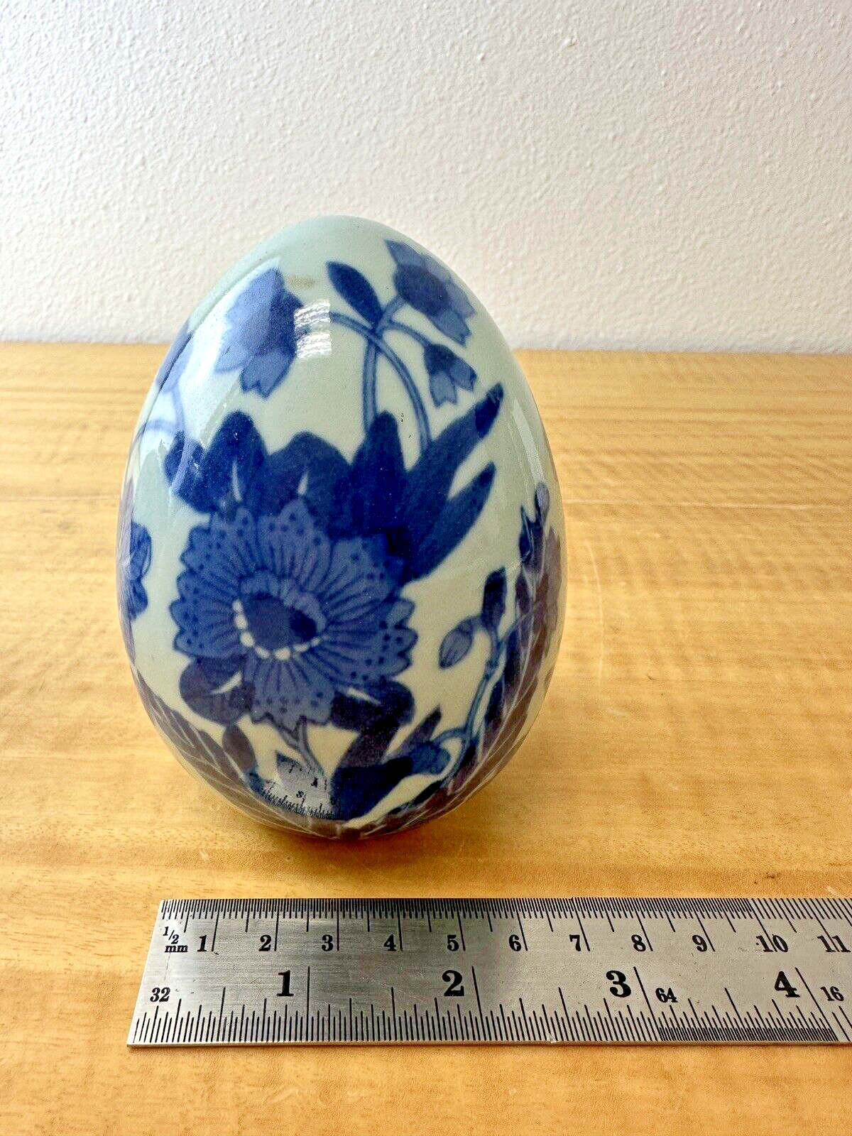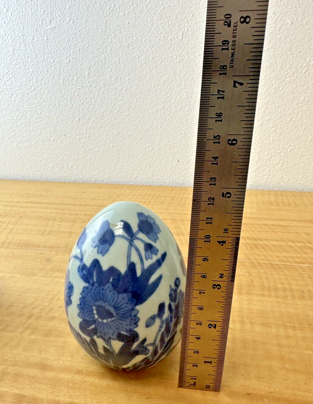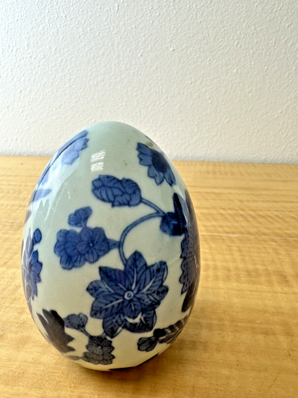 Porcelain handpainted Egg Large Blue White Flowers 5" tall Asian Inspired