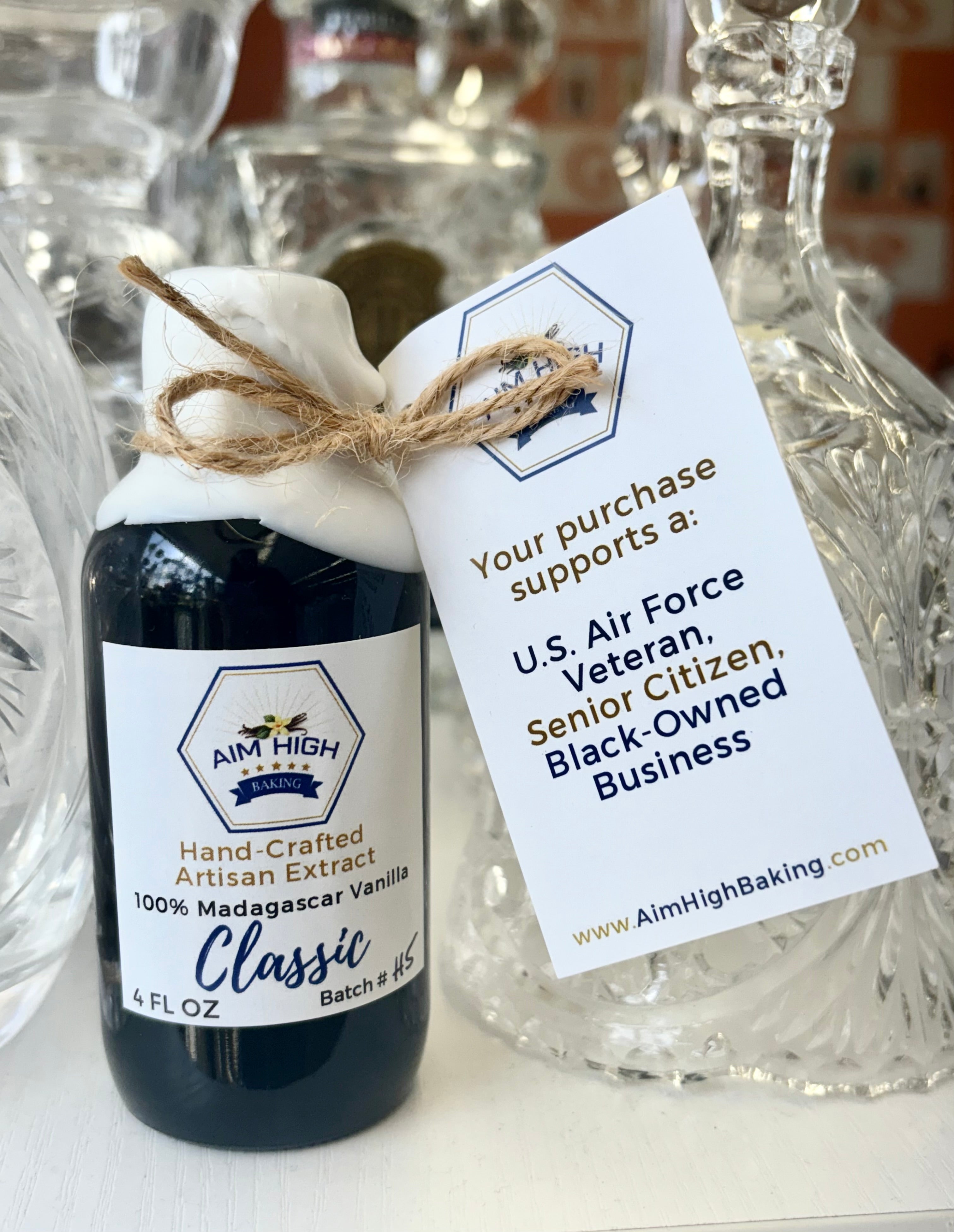 Larry, a Vietnam war veteran and Kitchens for Good baking apprentice, set out to create the perfect vanilla to take his baking to the next level. Larry’s Aim High Vanillas are created by hand in small batches and packaged in elegant glass bottles that keep best in a cool, dry place.