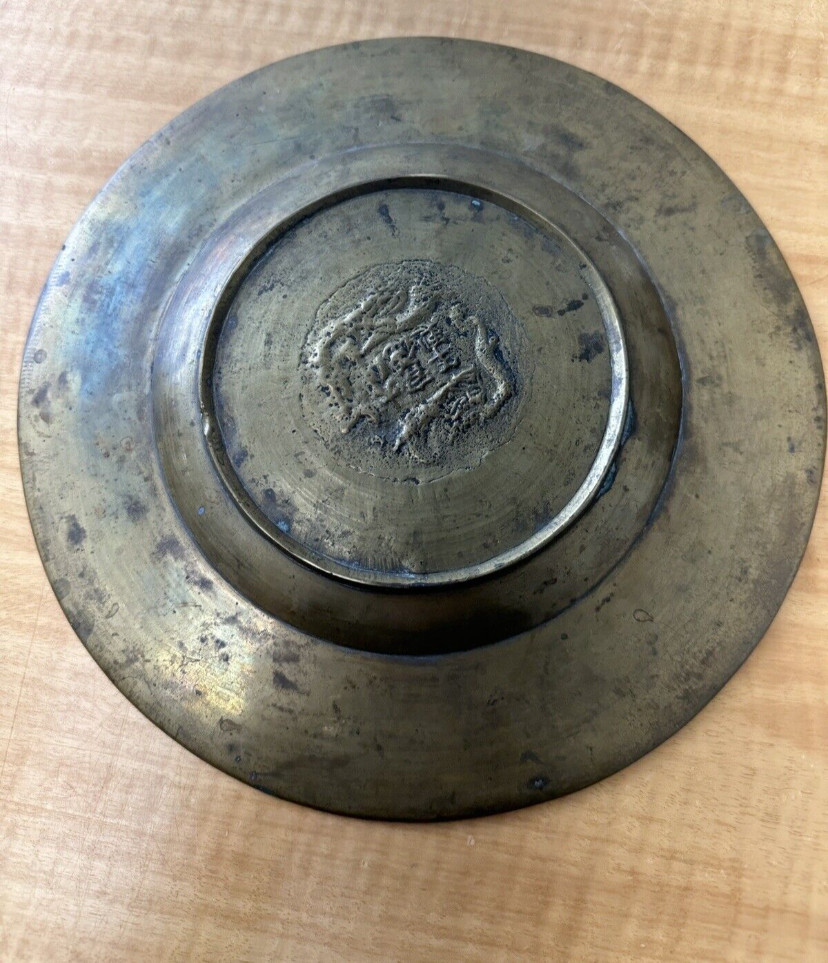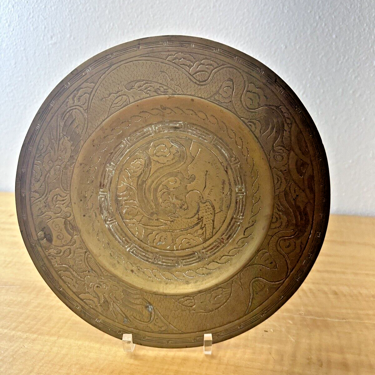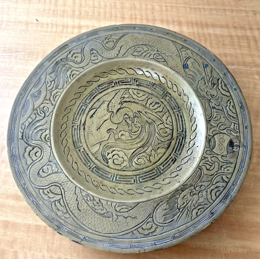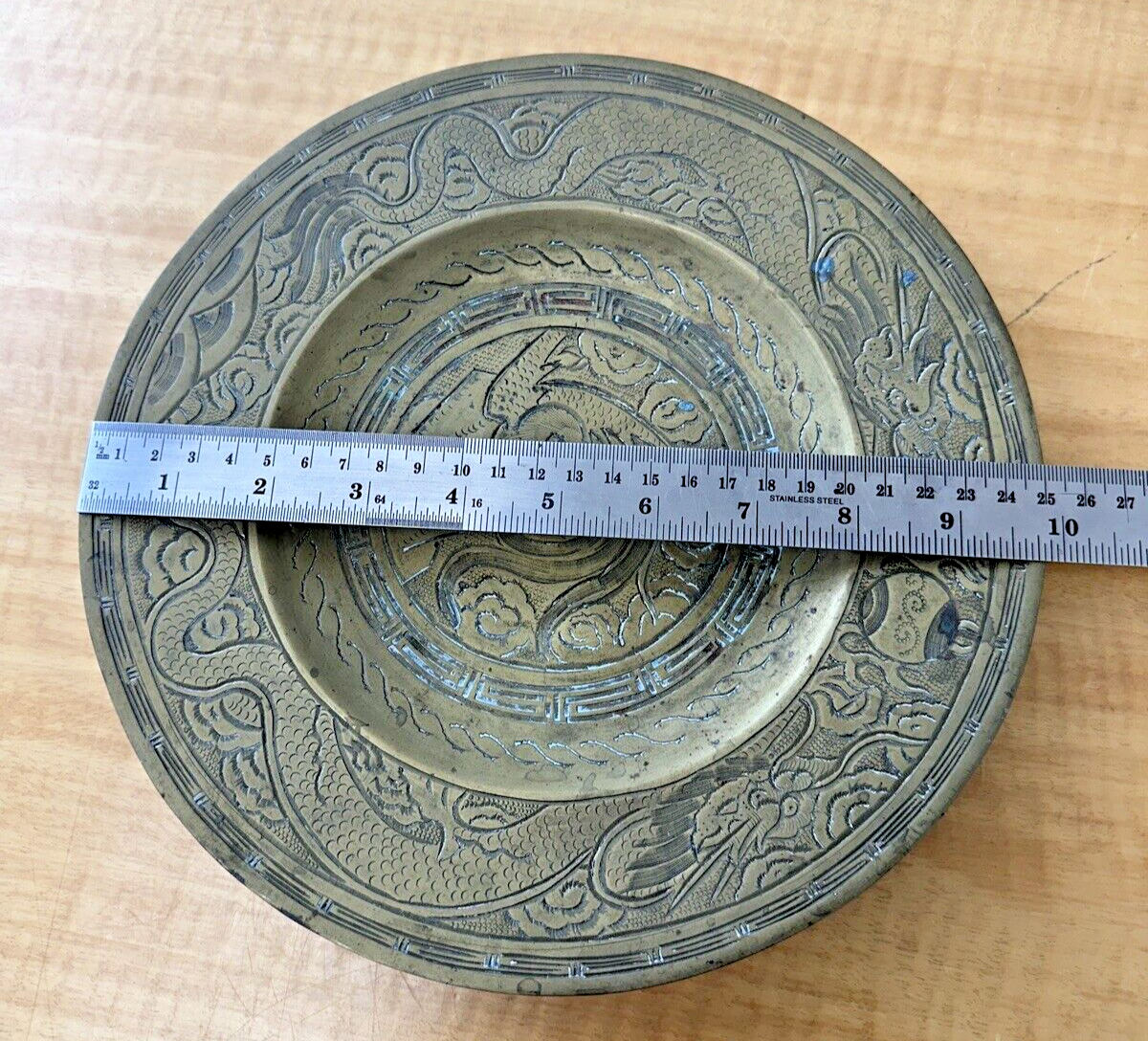 Chinese Heavy Brass Hand Engraving Dragon Charger 10” Wide Engraved