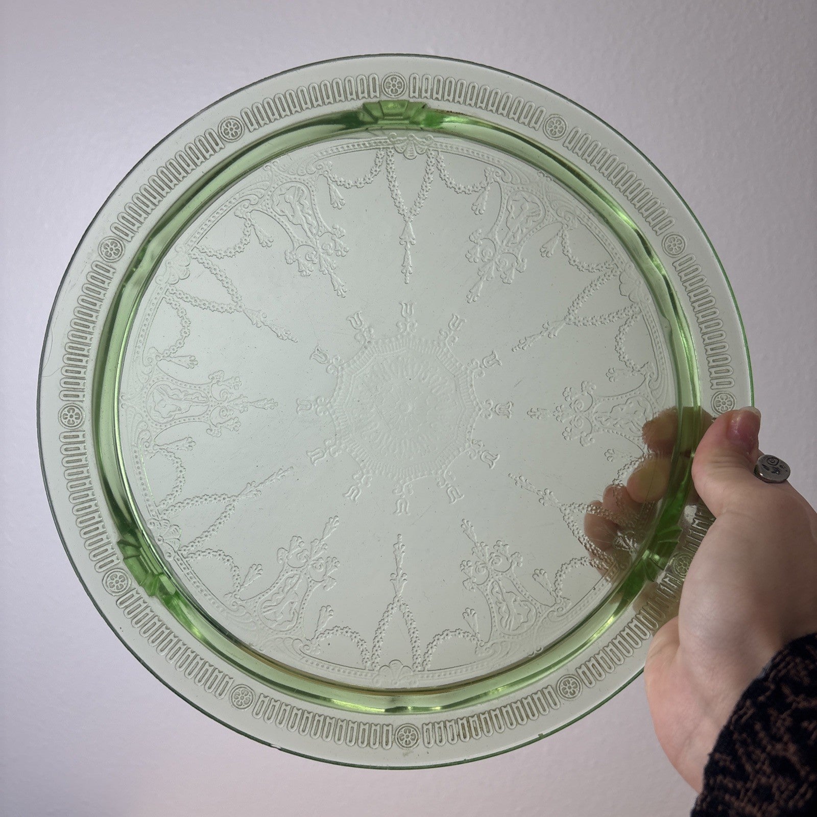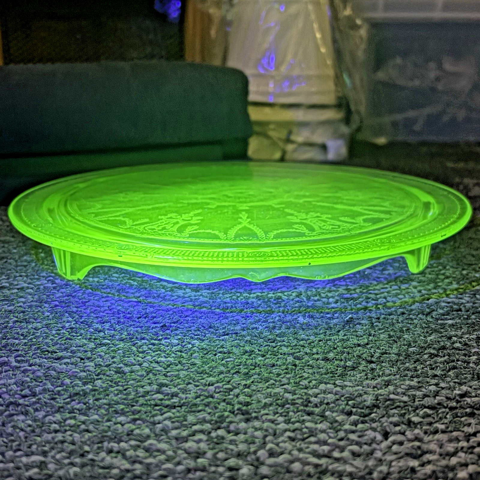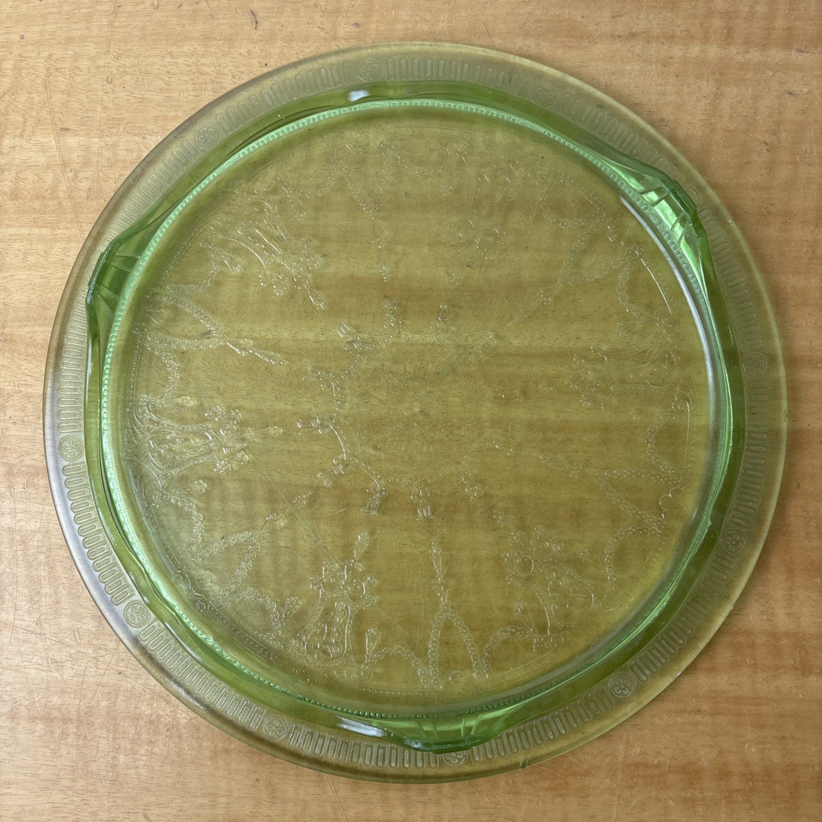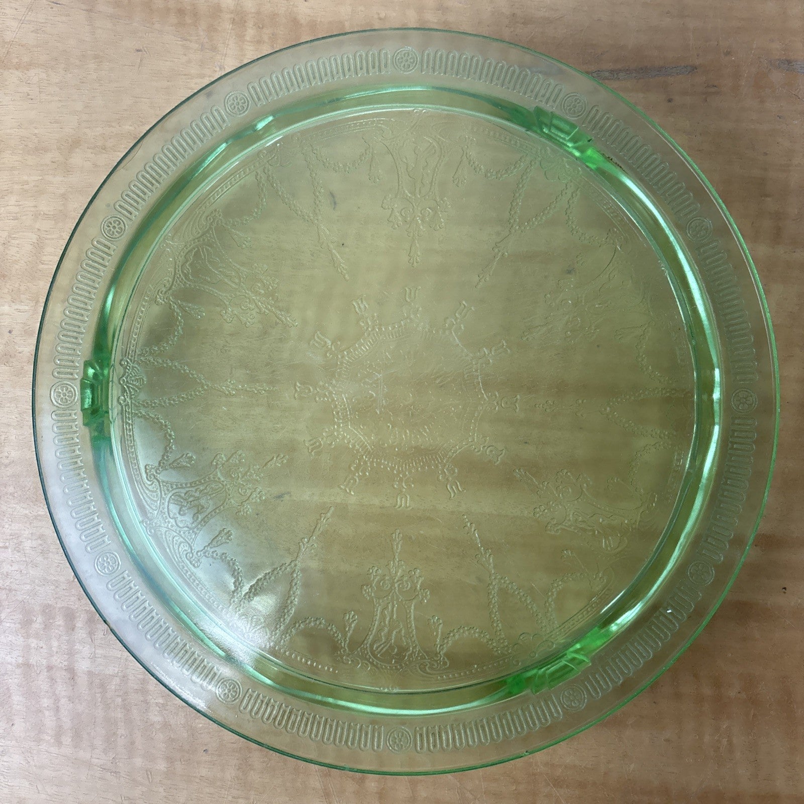 Green Uranium Depression Glass Footed Cake Plate