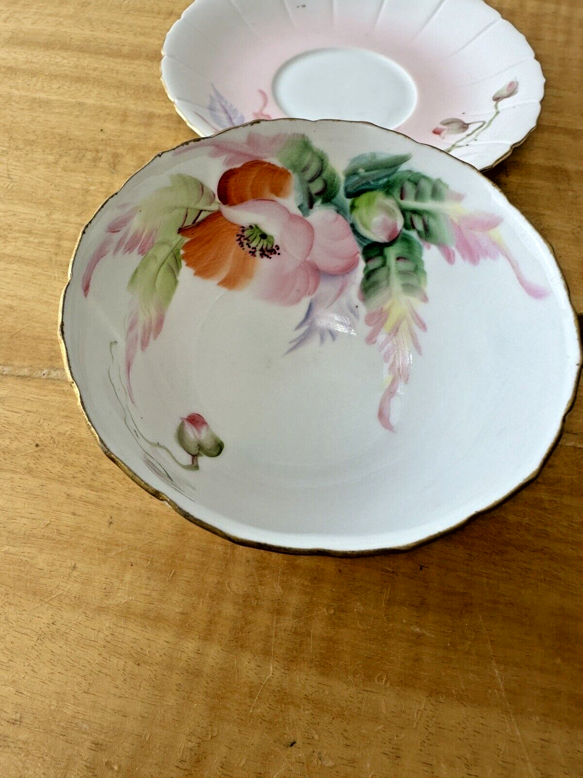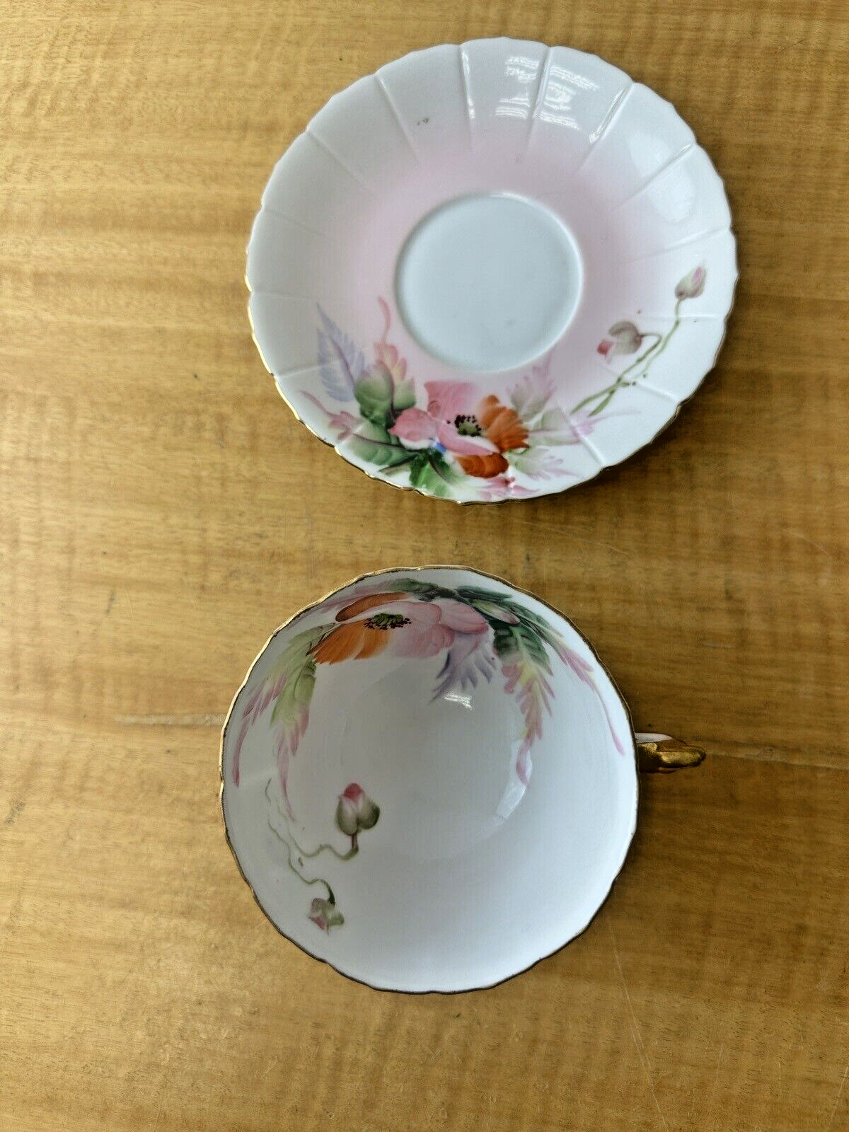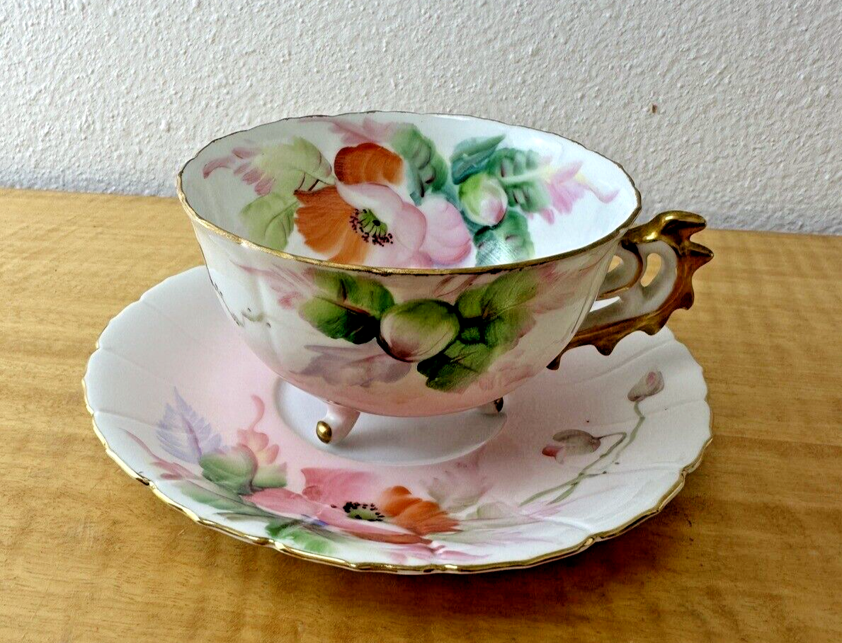 Takiro Japan Hand Painted Pink Roses Footed Cup and Saucer Set, Gold Trim