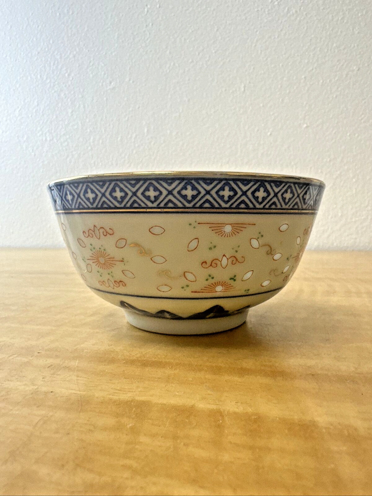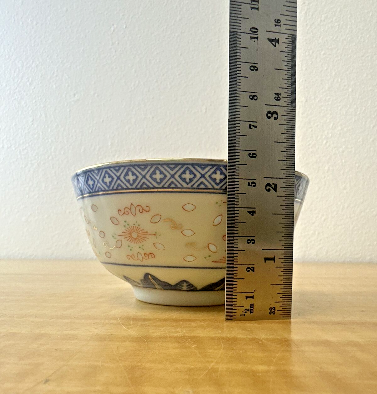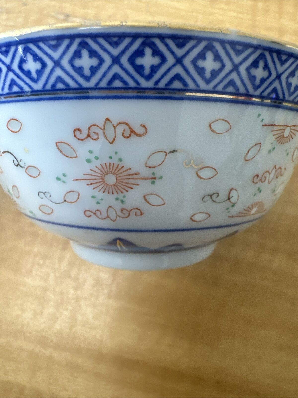 Vintage Chinese Rice Bowl Rice Pattern Grain Blue/White/Orange